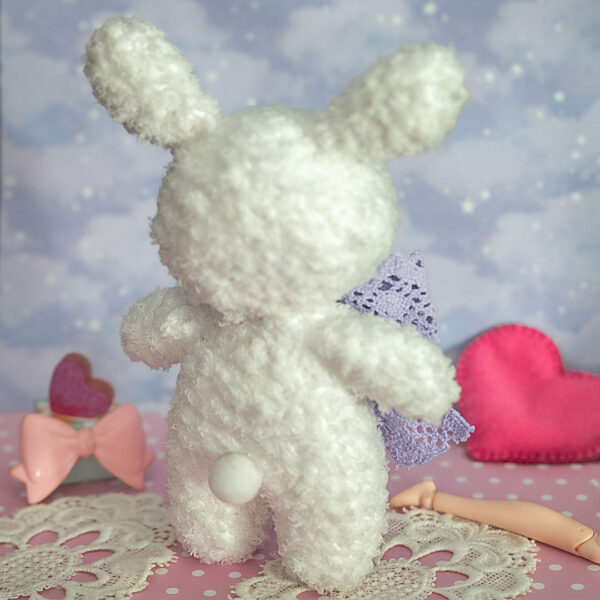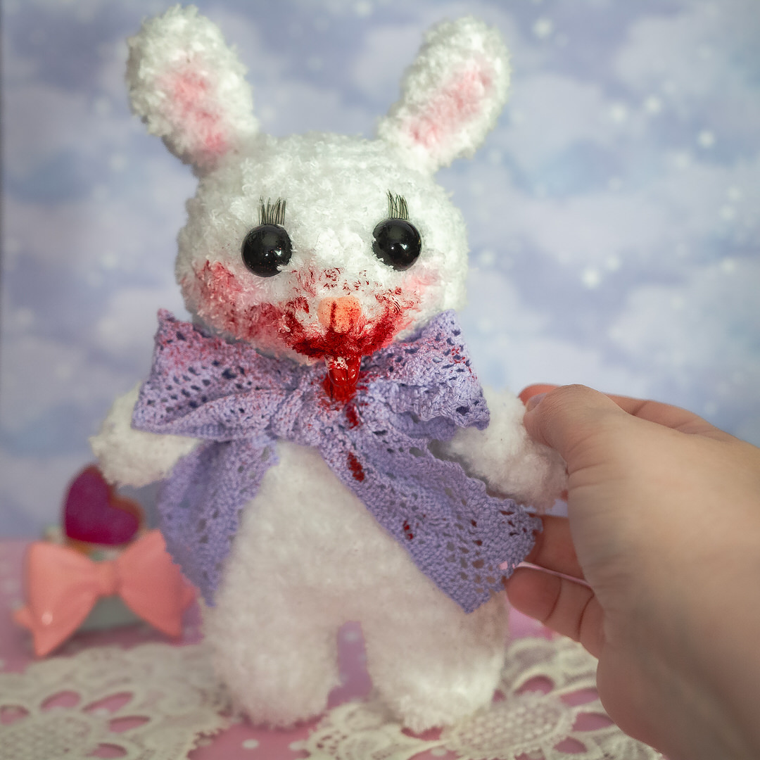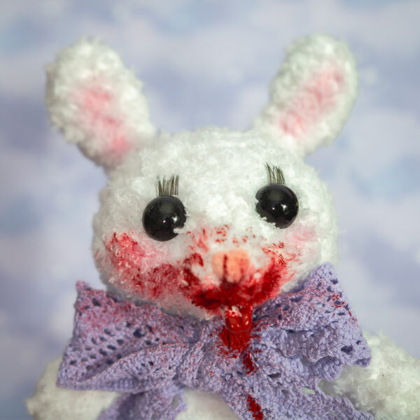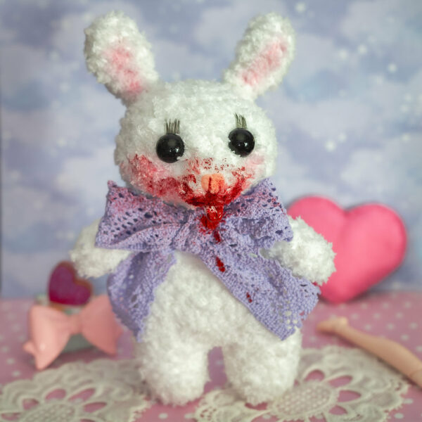 Il est blanc, tout doux et si mignon avec son joli nœud en dentelle… et ses dents couvertes de sang. Oui, ce lapin carnivore ne distribue pas des œufs, il distribue la terreur ! Ce lapin est une pièce unique crochetée à la main avec tout l’amour qu’inspire un brunch de Pâques forcé.